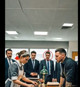 In the corner of the room, unnoticed by most, a young woman quietly mopped the marble floor. She wore a simple uniform, her hair tied neatly back, her movements calm and steady despite the tension surrounding her.