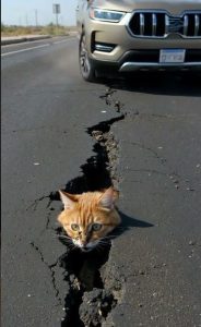 Mark knelt down carefully, feeling the heat of the asphalt radiating through his jeans. Up close, he could see how bad the situation was. The crack was narrow but deep, and the kittenโs leg was wedged at an awkward angle.