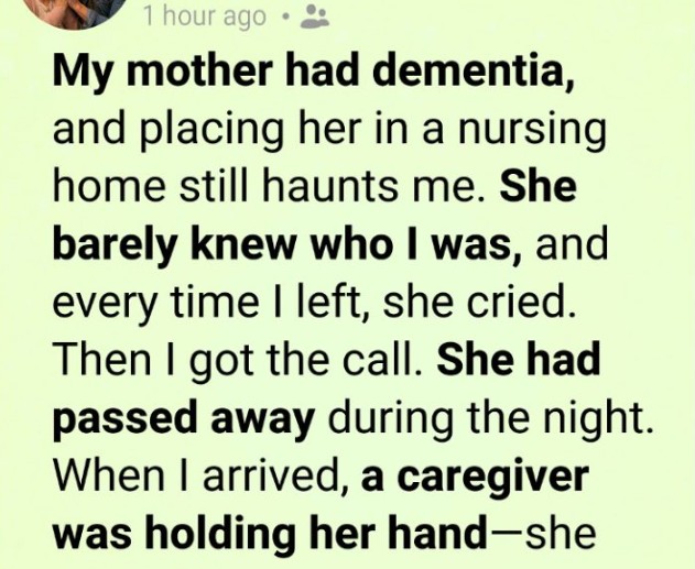 When I arrived, I found her room not empty. A caregiver named Sarah sat quietly beside my mother’s bed, still holding her hand. She apologized for being there, though there was no need. She had stayed after her shift, ensuring my mother would not face her final moments alone.