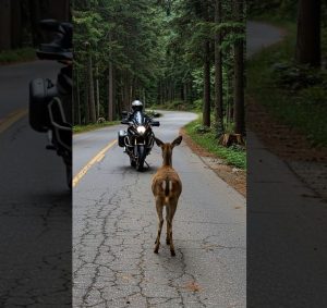 As Adrian slowed his bike to navigate a sharp curve, a sudden movement in the middle of the road made him hit the brakes. A large deer stood directly in his path.