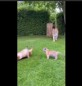 No one expected to see a friendship like this form, especially not in a place where wild instincts and domestic comfort are supposed to stay far apart. The dog had lived its life around humans, familiar with soft hands, steady routines, and the warmth of a safe home. The tiger cub, on the other hand, had entered the world with power written into its future, even before it could walk properly. Yet when their paths crossed, something extraordinary happened.