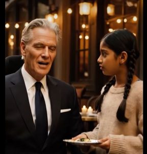 The restaurant was the kind of place where silence itself felt expensive. Crystal glasses lined white tablecloths, soft music floated through the air, and the scent of perfectly plated dishes lingered long after they were served. People didn’t come here just to eat; they came to be seen. Among them sat Victor Harrington, a self-made millionaire known for his sharp tongue, tailored suits, and complete indifference toward anyone outside his circle.