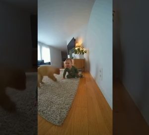 It was a quiet afternoon in the living room sunlight streaming through the curtains, soft music playing, and the gentle sound of a baby babbling on the carpet. The familyโs young puppy, a fluffy ball of energy with curious eyes, lay nearby gnawing on a toy.
