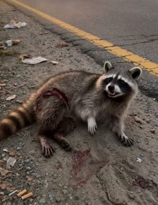 On the narrow gravel shoulder, just beyond the rumble strip, a small raccoon sat huddled against the guardrail. His fur was matted and dirty, one paw was swollen from an old injury, and his dark eyes reflected pure exhaustion and fear.