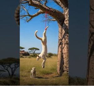 A cheetah father, known for his unmatched speed and grace, was running not after prey this time but to protect his two tiny cubs hidden behind a patch of tall grass.