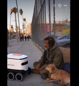 Late one afternoon, on a quiet city sidewalk, passersby witnessed a scene that felt almost unreal. A small delivery robot rolled carefully over cracks in the pavement, balancing a warm food container on top of its metal body. What made the moment extraordinary was not the machine itself, but where it stopped. Instead of arriving at an office or a modern apartment building, the robot gently halted in front of an elderly man sitting on the street beside his loyal dog.