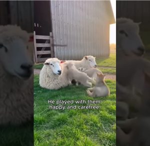 The pup had been abandoned near the edge of the forest, tiny, shivering, and clearly too weak to survive on its own. A mother sheep, known among the flock for her gentle nature and surprising courage, found the pup alone. Despite instincts that might have warned against it, she nuzzled him gently, offering warmth and protection. She shared her food, sheltered him from the elements, and, most remarkably, treated him as one of her own. The other sheep watched warily at first, uncertain how to respond to the presence of a natural predator among them.