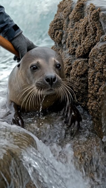 Its body was wedged tightly between the rocks, pressed in by the narrow space and the constant surge of the tide. Each wave rolled in and slammed against its back, covering it in foamy water before pulling away again. The animal’s dark eyes were wide, its chest rising quickly with fear and exhaustion.