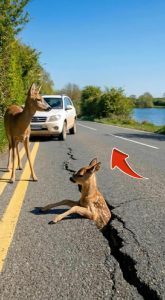 The crack in the road was deeper than it lookedโprobably six or seven inches wide and jagged from years of freezing and thawing. The fawn must have stepped into it while trying to cross the road and then slipped further down when it tried to pull out. Its tiny hooves were wedged at an awkward angle, and the more it struggled, the tighter it became trapped.