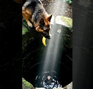 Jax did something his trainers had never taught him. He saw a frayed utility rope that had fallen partially into the well during the hiker’s initial tumble. Jax grabbed the thick end of the rope in his jaws and, with a calculated risk that defied his training to stay clear of edges, he began to lower himself onto a narrow, slippery stone ledge just four feet down. From there, he dropped the rest of the rope further into the dark.