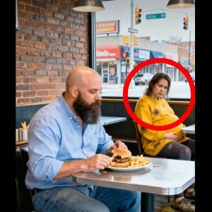 I watched her lead the plate back to an empty booth, setting it carefully before herself. She sat down slowly, her shoulders slumping with relief as she took a cautious bite. The first taste of the warm, fragrant burger seemed to ease the tension in her body. Her eyes softened as she looked at the food, and a tiny smile flickered across her lips, the kind of smile that comes when a person realizes they have been seen, acknowledged, and treated with compassion.