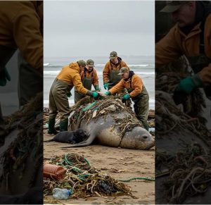 Without hesitation, the fishermen pulled their boat closer to the struggling mother. With careful hands and sharp tools, they worked to untangle the thick ropes and nets cutting into her body. The baby seal stayed close, never leaving sight of its mother, as though urging the men to hurry.