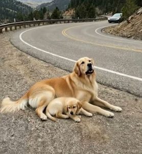 A driver named Alex Rivera noticed the strange behavior while approaching the area. At first he saw the big dog running and barking, but when he looked closer, he spotted the tiny puppy trembling dangerously close to the road.