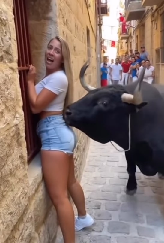 The bull stood just inches behind herโclose enough for her to feel every warm breath against her back. Its horns were leveled, powerful muscles twitching with tension. The alley fell silent. People covered their mouths, some whispered prayers, others turned away in fear of what was about to happen.