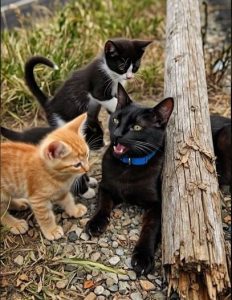 Inside the battered box were three tiny kittens โ€” no more than four or five weeks old. Their eyes were barely open. One was a fluffy gray tabby, another pure black with white paws, and the third a delicate calico. They were huddled together, meowing weakly, their small bodies trembling. The box had been placed deliberately in the middle of the road, as if someone had wanted them to be run over and end their lives quickly. Tire marks showed that at least two cars had already swerved around the box.