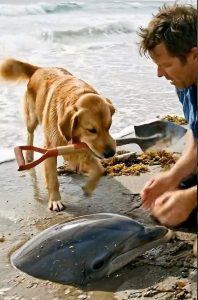Sunny refused to leave the dolphinโ€™s side. The golden retriever lay down close, pressing his warm golden body against the dolphinโ€™s side to provide shade and comfort. He whined softly, occasionally licking the dolphinโ€™s head gently, as if trying to reassure the struggling animal that help was coming.