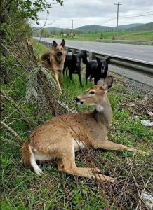 A young doe stood frozen on the shoulder of the road, her slender legs trembling. One front leg was awkwardly twisted, and she kept trying to step forward only to collapse onto her side.