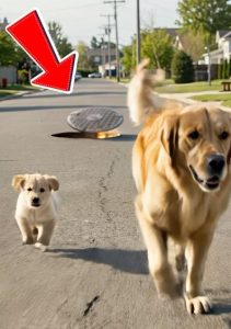 Beside her trotted her six-week-old puppy, a tiny ball of fluff with the same warm golden fur and curious eyes. The pair had been following the bus for nearly a mile, the mother keeping a protective eye on her baby while matching the vehicleโ€™s pace with surprising endurance.