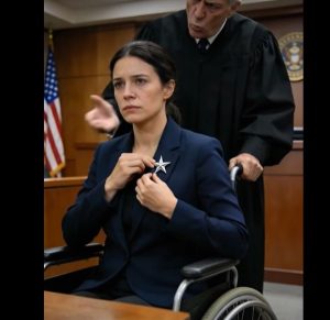 She sat at the witness table, posture straight, hands folded calmly over a leather folder. Her dark suit was simple, unadorned, and her hair was pulled back in a neat, practical style. Only one detail stood out: the small medal pinned to her lapel, a military commendation that glinted faintly under the courtroom lights.