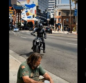 Behind him, a motorcyclist saw everything. Dressed in a helmet and worn riding jacket, he had stopped just a few feet back, his engine humming softly. He glanced from the trash to the driver, then down at the litter scattered along the curb. Instead of shaking his head or riding off in silence, he made a quick decision. As the light stayed red, the motorcyclist dismounted, walked calmly to the discarded bag, and picked it up.