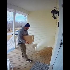 After a few tense yet awe-filled moments, the delivery man gathered his composure. He took a cautious step sideways, careful not to provoke another dramatic advance. Still smiling in disbelief, he gently placed the package on the ground near the gate instead of approaching the door. He nodded politely—half joking, half respectful—toward the peacock, as if acknowledging a silent agreement: Your yard, your rules.