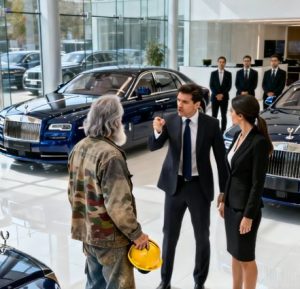 That morning, a man walked through the dealershipโs front doors wearing a simple jacket, worn jeans, and ordinary shoes. His hair was slightly messy, and he carried no sign of wealth or importance. To anyone glancing quickly, he looked like an average customerโor perhaps someone just browsing without serious intentions.