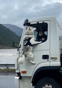 Husky police dog stops truck in middle of road to save life