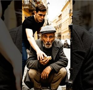 He sat on the edge of the sidewalk, shoulders slightly hunched, hands rough and trembling from the cold. The city moved around him like a river that had long since learned how to flow without noticing the stones beneath it. Cars passed. Shoes clicked against pavement. Laughter drifted by and disappeared just as quickly. He had learned not to look up too oftenโhope can hurt when it goes unanswered.