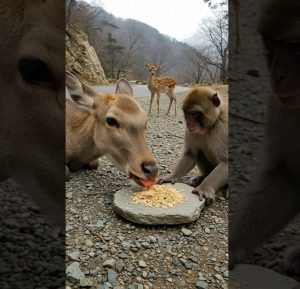 He spotted the fawn shivering under a fallen tree, frightened and unable to move. Kibo quickly ran to the mother deer and made a series of loud, urgent calls, alerting her to her childโs location. The deer followed, her steps careful but swift, guided by the monkeyโs signals.