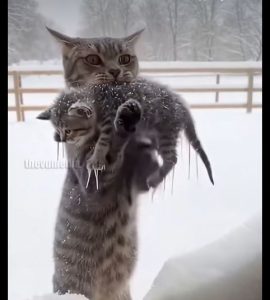 In the middle of this freezing den, a mother cat was engaged in a fierce protection of the only thing she had left: a tiny kitten whose life was fading with every manual reset of the wind. The kitten, a hungry boy for warmth, had become a stray spark of life in a world that felt like an easy target for the cold. His fur was matted with frost, and his tiny body had begun to succumb to the harsh lesson of hypothermia, his breathing a faint, rhythmic vocal rasp.