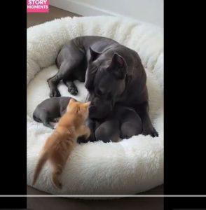 Rather than rejecting the kitten, the dog nudged it toward her own puppies. The little ones were confused at first, sniffing the tiny creature that looked and smelled so different from them. But under their motherโs calm guidance, the puppy pack accepted the kitten as one of their own.