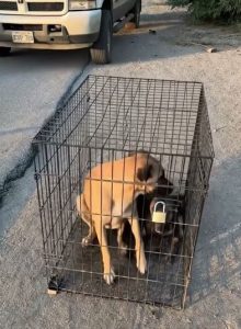 On the gravel shoulder, half-hidden by tall weeds, sat a large wire cage. Inside were two dogsโ€”clearly abandoned. One was a medium-sized brown mutt with matted fur and visible ribs, pressing itself against the back of the cage.