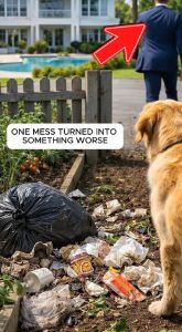 He found the bag of trash Derek had been too lazy to take out earlier that week. With a joyful snarl, Max ripped the bag open and began flinging its contents all over Derekโs yard โ old coffee grounds, banana peels, empty beer cans, and soiled paper towels rained down like confetti from hell. The once-tidy (though neglected) backyard quickly turned into a disaster zone.