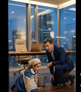 The little girl moved through the office with surprising grace, carefully avoiding chairs and desks, her mop swishing across the marble floors in uneven but effective strokes. Employees peeked from behind doors and cubicles, unsure if they should laugh, cry, or call security. It didn’t take long for whispers to spread: The CEO let her clean. She’s… a little girl. Her mother is in the hospital.