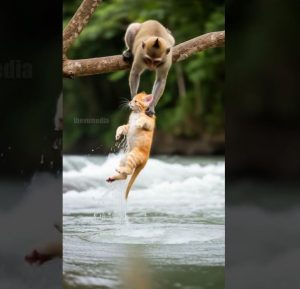 In a quiet corner of the forest, by a small riverbank, something incredible happenedย a scene that melted hearts all around the world. A tiny kitten had accidentally fallen into the water, struggling to stay afloat. Its weak cries for help echoed through the trees. Out of nowhere, a monkey appearedย curious at first, but then suddenly realizing the danger the little creature was in.