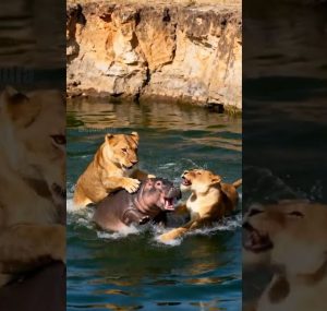 It began with the quiet prowl of a lion. Hidden in the tall grass, the predatorโs golden eyes were fixed on a tiny hippo calf grazing near the edge of a cliff. Alone and unaware of the lurking danger, the baby hippo was seconds away from becoming prey.