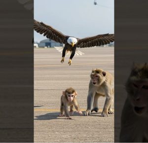 In a blur of motion, the shadow cut through the sunlight, growing larger and darker with terrifying speed. Other monkeys screeched and scattered, leaping wildly between branches. Chaos erupted in the canopy. The mother monkey had only seconds to react.