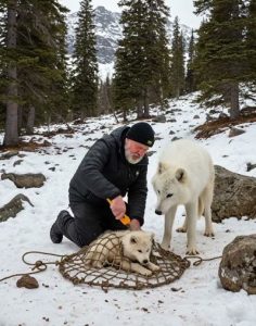 Out of the swirling snow emerged a magnificent white snow wolf, her fur matted with ice. In her mouth she carried one tiny cub, while another small pup stumbled at her heels. Luna stopped a safe distance from the old man, laid Shadow gently in the snow, and looked directly at Elias with those intelligent golden eyes. She whined softly, then turned her head back toward the high ridge where her den lay, as if begging him to understand.