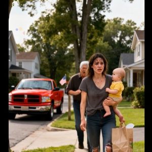 The late afternoon sun hung low over our quiet Midwestern street, casting long shadows across the pavement as I limped slowly along the sidewalk. My baby rested heavily on my hip, his small fingers gripping the collar of my worn sweater while his soft breathing brushed against my neck.