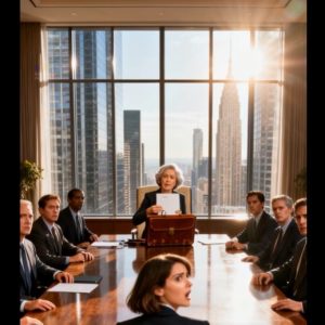 She sat with perfect composure, her posture straight, her expression controlled. She wore a tailored suit the color of winter steel, her dark hair pulled neatly back. Around her, members of the board stood in silent support, their faces tense yet resolute.