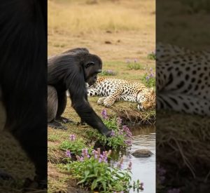 Sensing the change, the leopard attempted to pull free, but the chimpanzee gestured and vocalized sharply, almost as if instructing it to remain still. Whether by coincidence or understanding, the leopard paused.