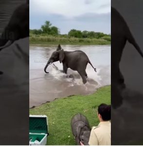 Other elephants in the herd joined in, circling and creating a protective barrier, trunks swinging and ears flaring. The crocodile realized quickly that it had underestimated the herdโ€™s coordination and retreated back into the deeper water, its meal lost.