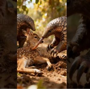 Drawn by the distress of the fawn, the pangolins approached cautiously. One by one, they began to use their natural abilityย  eating ants. With remarkable teamwork, they surrounded the fawn, devouring the swarm that threatened its life. Slowly, the red ants disappeared, and the young fawn was freed from its painful torment.