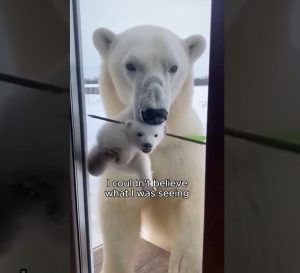 My heart leapt. Polar bears are magnificent, apex predators of the Arctic, and yet here she was, approaching my door as if she had a reason to trust me. The mother bear sniffed at the wooden porch, her massive paws crunching against the snow, while the cub whined softly, struggling to keep pace.