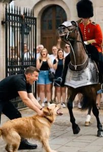 Without hesitation, the golden retriever bolted forward, ducking under the barrier and racing straight toward the line of guards. Tourists gasped. Security officers moved to intercept, but Max was faster. He skidded to a stop directly in front of Guardsman Reilly, barking sharply and urgently, then lunging forward to grab the hem of the soldierโs tunic gently in his teeth and tug.
