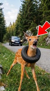Its small body twisted in panic, but the rubber held firm. Each attempt to pull free only caused more exhaustion. The tireโs rigid edges pressed against its legs, making escape impossible without help. Fear filled the fawnโs wide eyes as it let out soft, distressed sounds that echoed faintly through the trees.