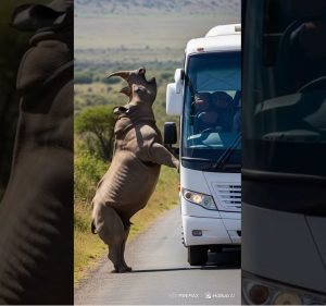 It was an ordinary school morningย the road stretched through a green valley, filled with childrenโs laughter echoing from a yellow bus. Everything seemed peaceful until, out of nowhere, a massive rhinoceros appeared on the road, blocking the way. The driver pressed the brakes in shock, and for a moment, time seemed to stand still.