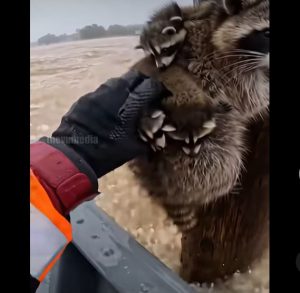 But in the middle of a particularly dangerous stretch of road, a team of rescuers stopped their boat. They had been battling the floodwaters for twelve hours straight, but when they looked up and saw this mother raccoon clinging to a pole, the exhaustion vanished. She wasn’t just a wild animal; she was a mother at the end of her strength, and her eyes held a silent plea that no human could ignore.