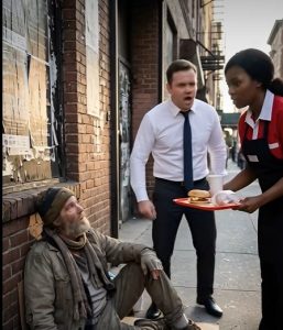 The man looked up, startled. His eyes flicked from her face to the food, then back again. โIโฆ I canโt pay,โ he said quietly, already bracing himself for rejection.