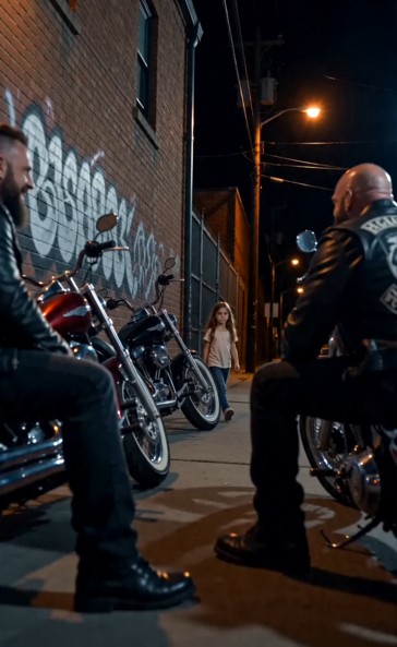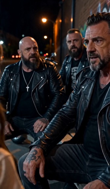 A row of motorcycles lined the curb, their metal surfaces reflecting the dim glow. Nearby, a group of men sat together on a worn wooden bench, their presence commanding attention without a single word.